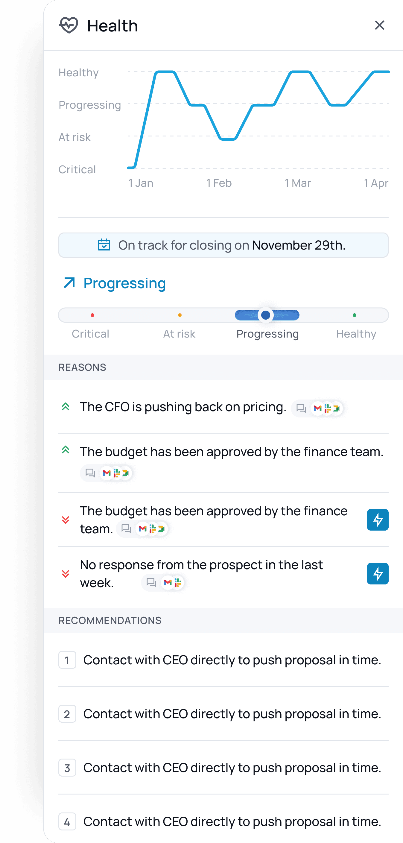 Get quarterly forecasts that show exactly why each deal is likely to close or slip. Every prediction comes with the signals that drive it. Predictions you can trust and explain.
