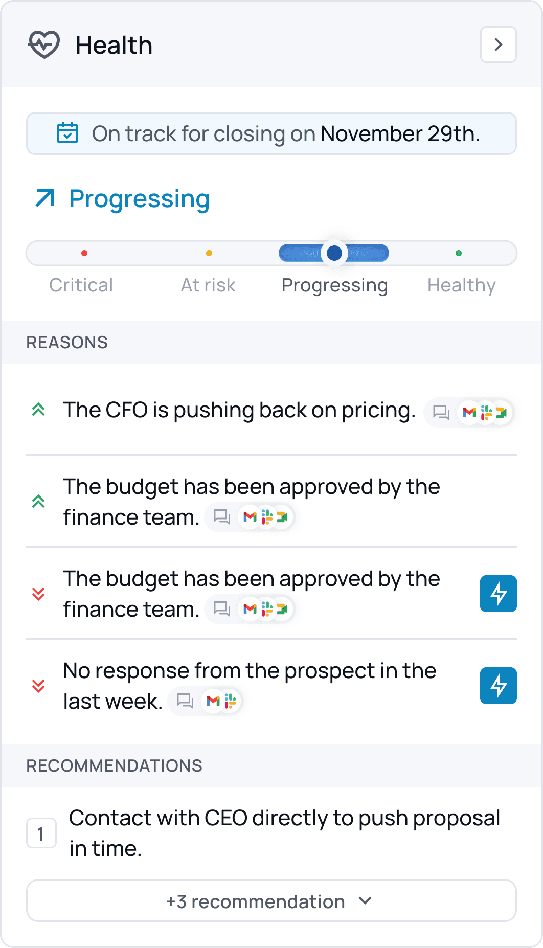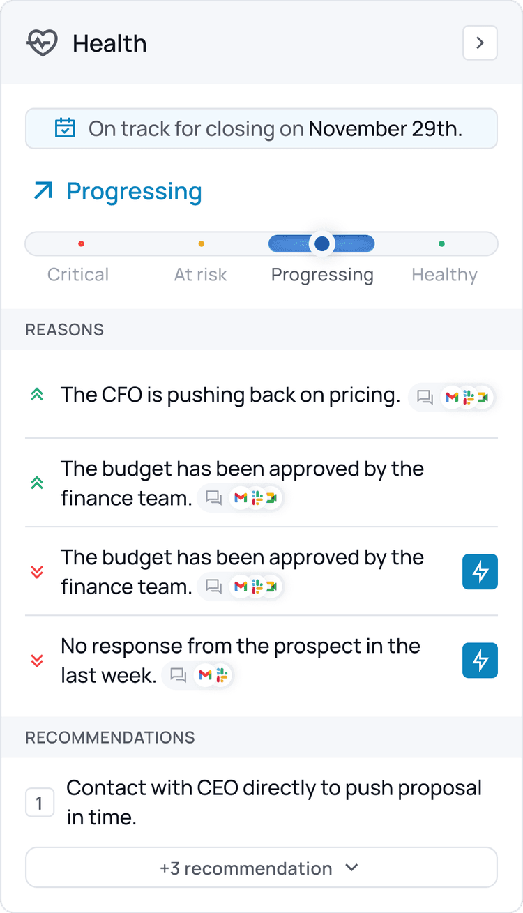 - Surface the actions that matter most at each stage, keeping deals moving forward with precision.