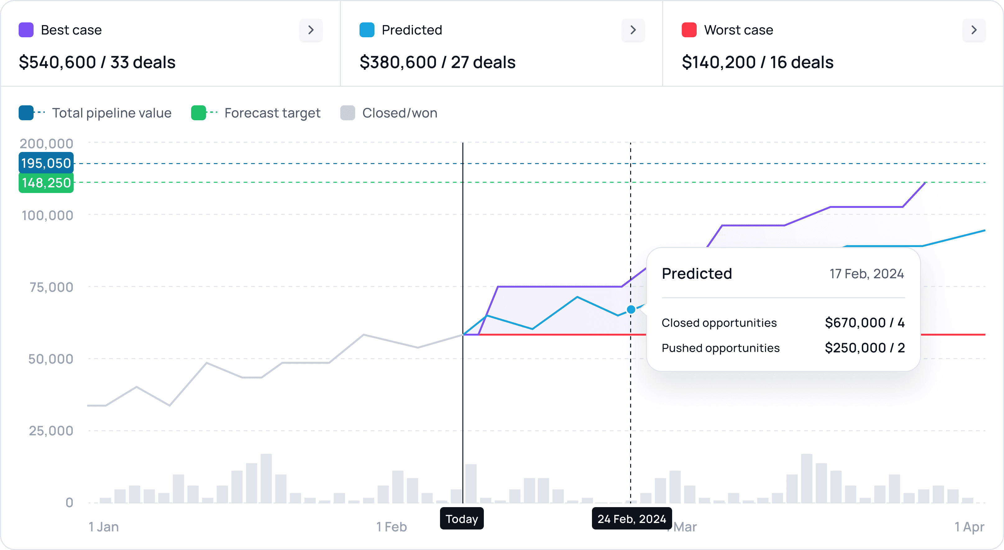 Get quarterly forecasts that show exactly why each deal is likely to close or slip. Every prediction comes with the signals that drive it.