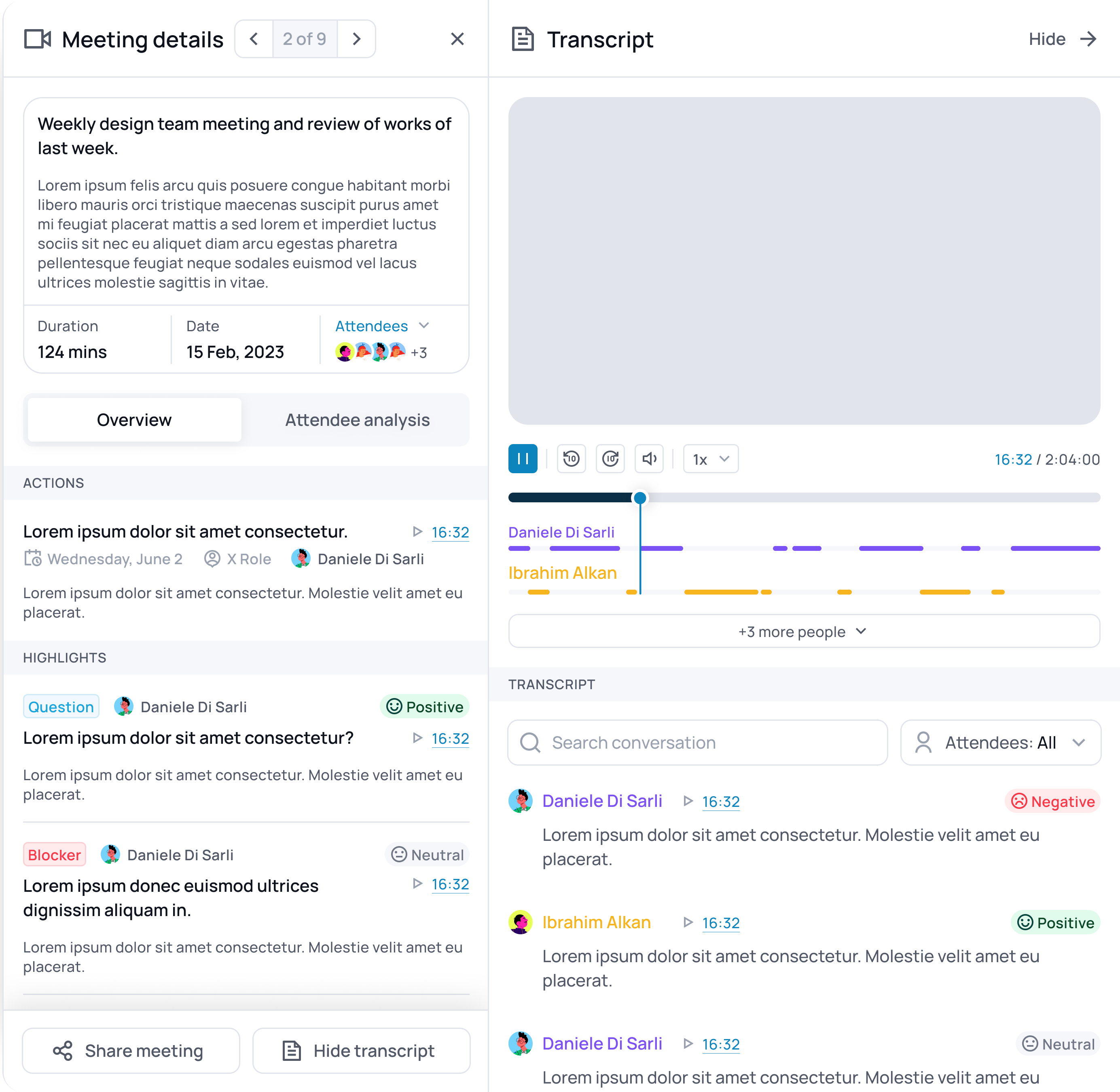 Automatically transcribe and analyze every sales call and meeting to extract topics, objections, questions, sentiment, and key moments without manual note-taking.