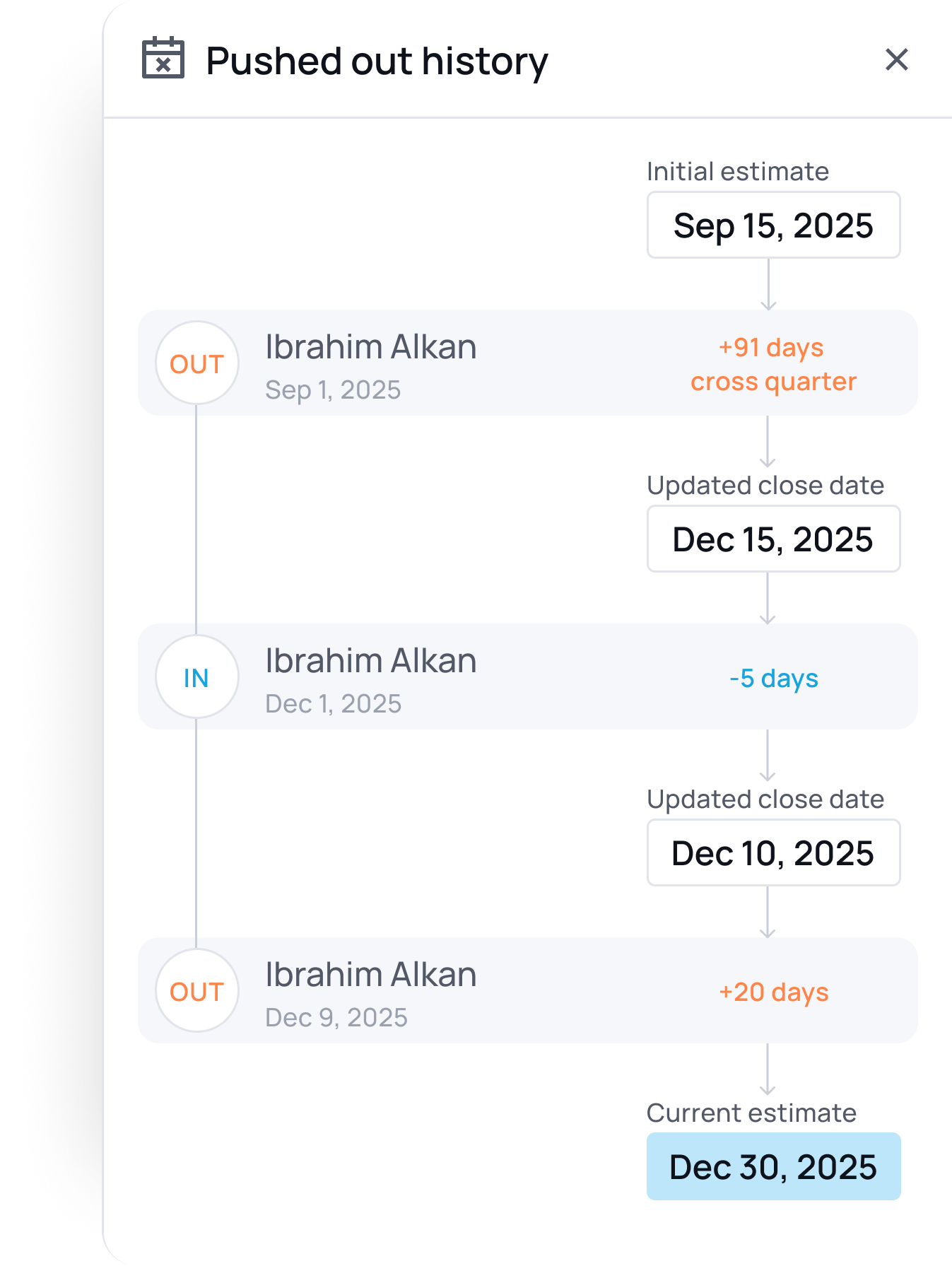 Pushed Out History tracks deals that repeatedly slip past their close dates, helping you identify slippage patterns, understand root causes, and prevent future push-outs before they happen.