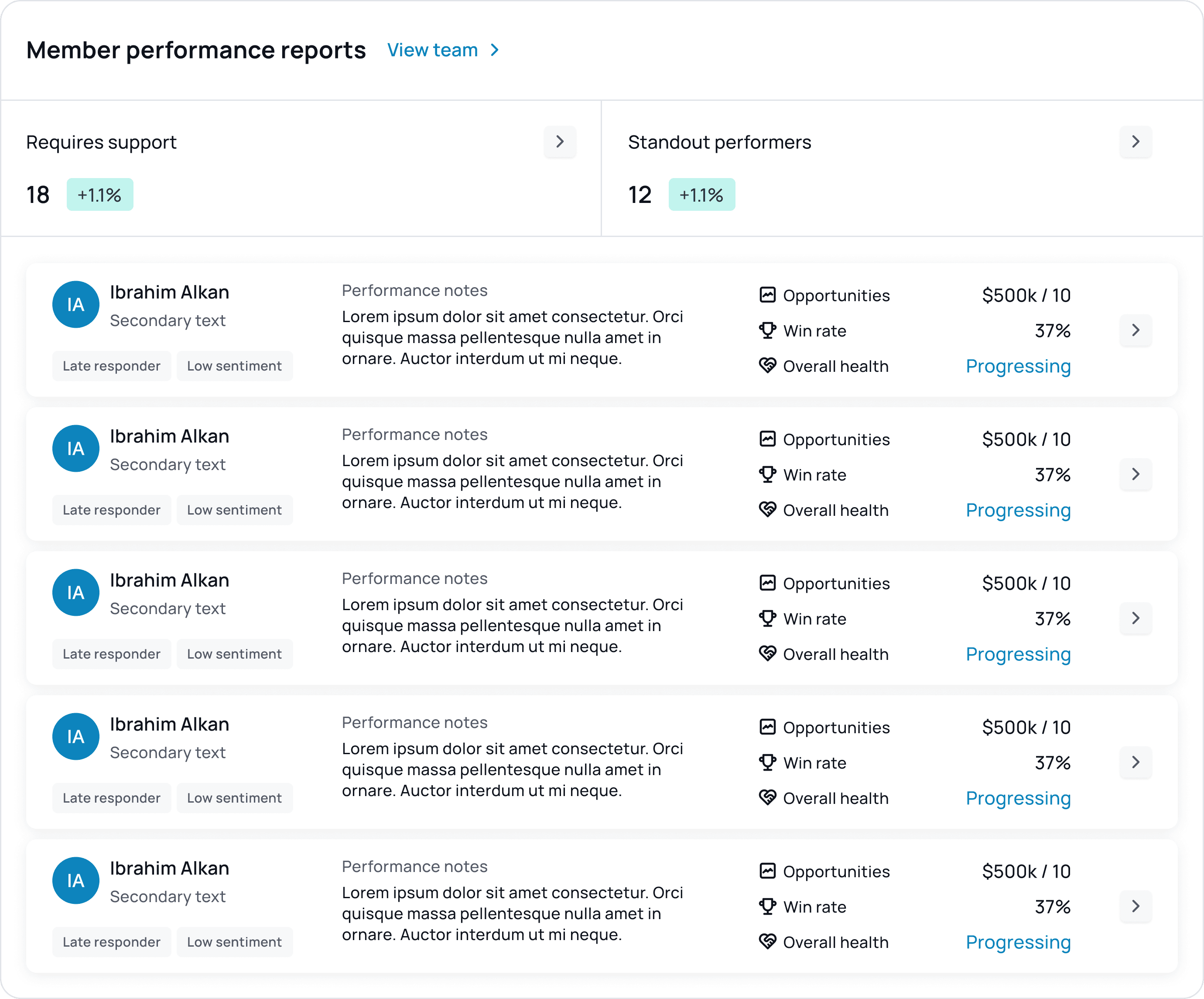 Get tailored, actionable coaching recommendations for each rep based on their individual behavior patterns, deal outcomes, and development areas.