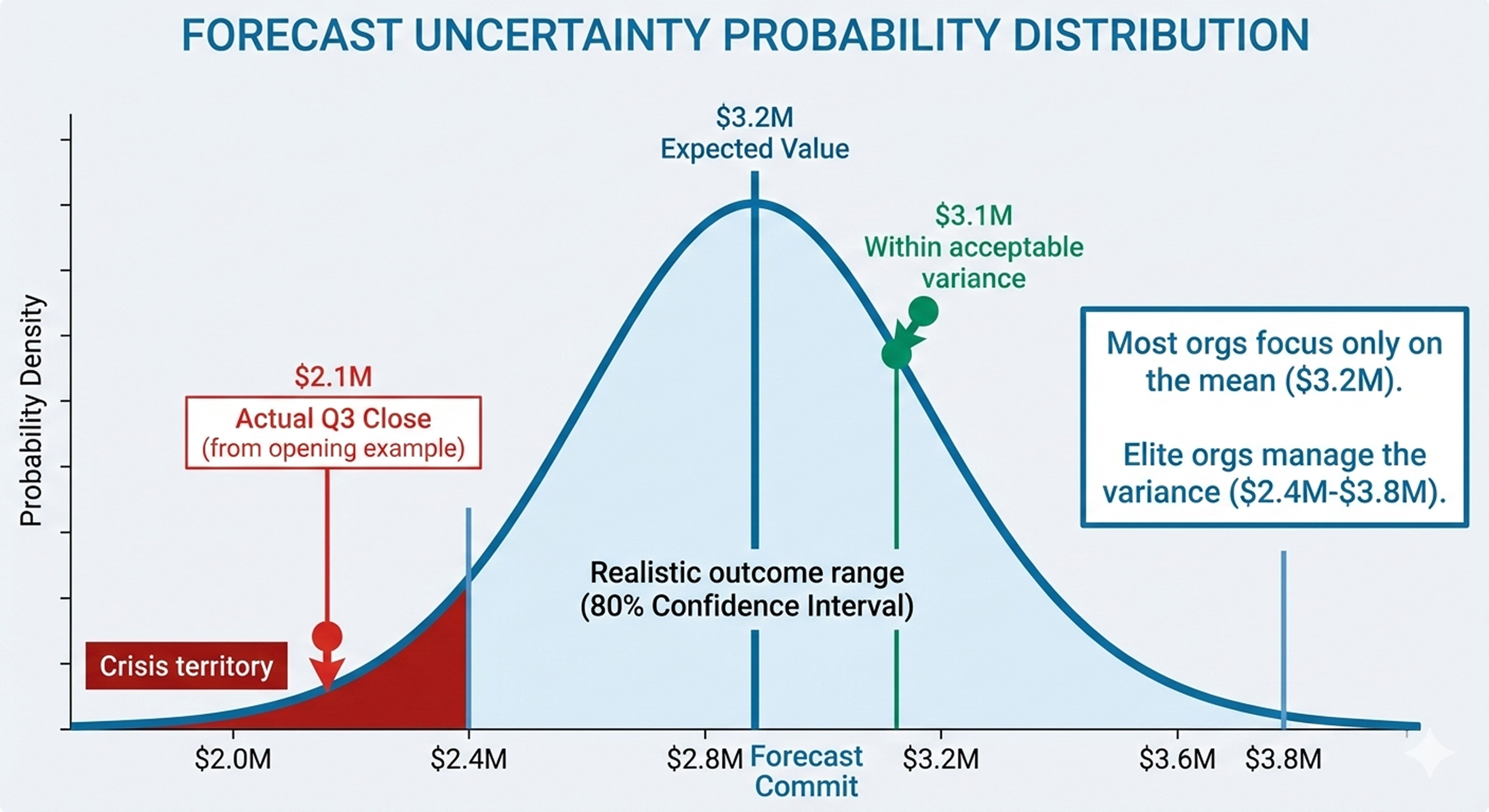 In forecasting, we care deeply about two properties: the mean (are we centered on the right number?) and the variance (how wide is the range of likely outcomes?). Most organizations obsess over the mean while ignoring variance entirely. They forecast $3.2 million and celebrate when they hit $3.1 million, without acknowledging that the true uncertainty band was $2.4 million to $3.8 million. When you ignore variance, you can't properly staff, you can't set realistic expectations with the board, and you can't distinguish between good execution and good luck.